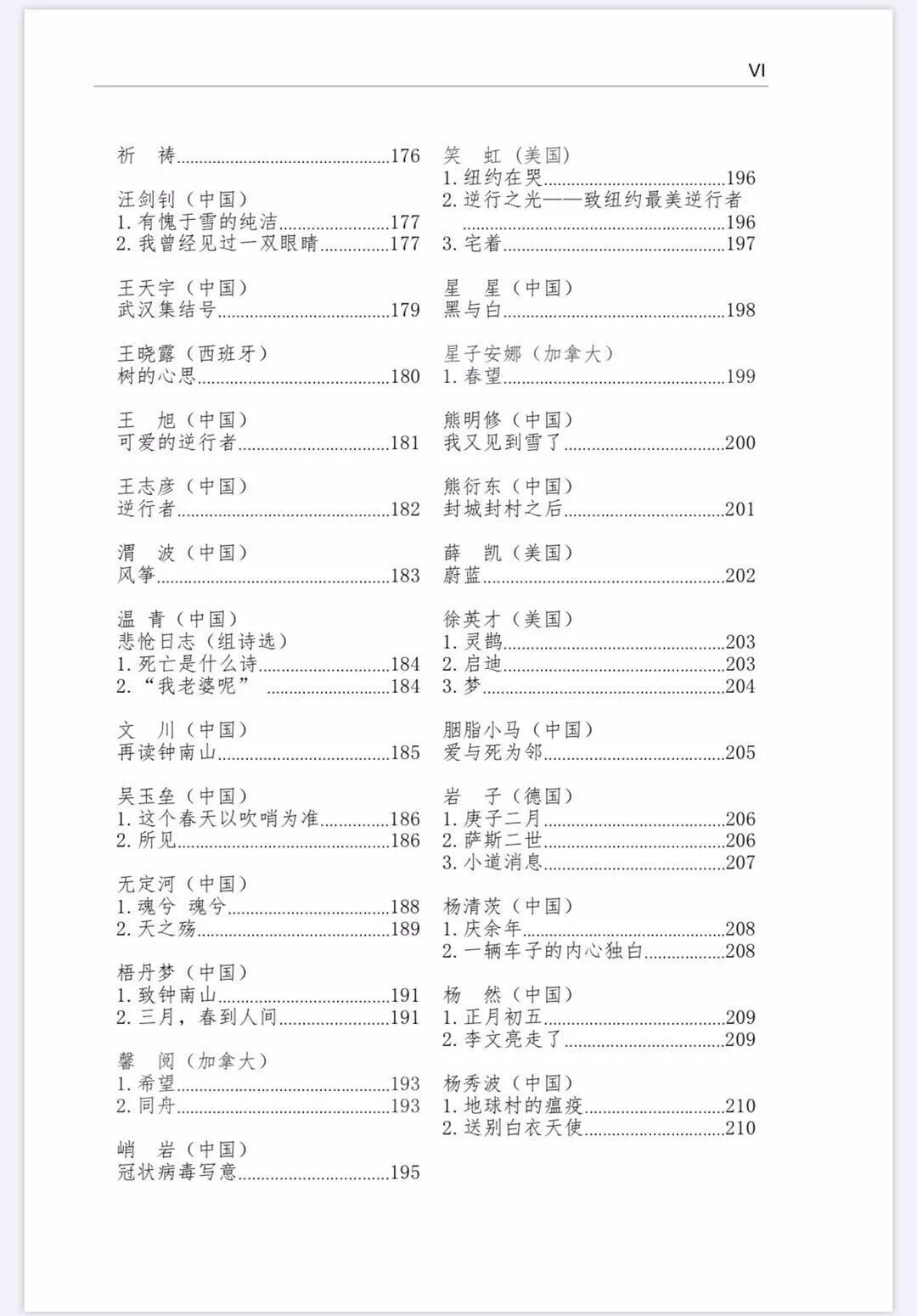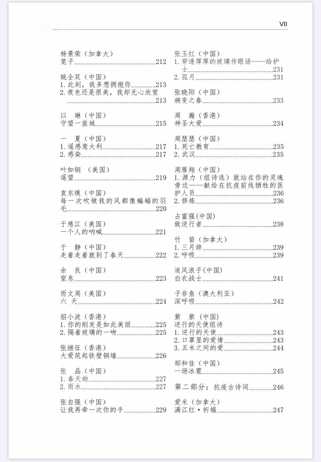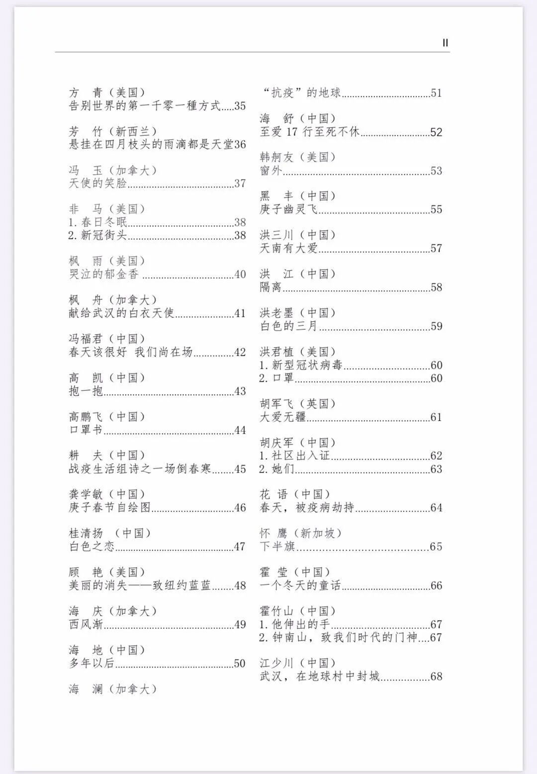 我们本着不厚名家、不薄新人,以作品质量为遴选的原则,经过数星期日以继夜的筛选,精选出两百余位诗人的近三百首优秀作品。这些诗人来自世界各地,有两岸三地土生土长的华语诗人,有包括日本、新加坡、澳大利 亚、新西兰在内的亚太国家的华语诗人,还有包括美国、加拿大、德国、英国等等远在西方国家的华语诗人。其中既有诗坛名家,也有诗界新秀,汇集了活跃在海内外诗坛的一线华语诗人的抗疫佳作。