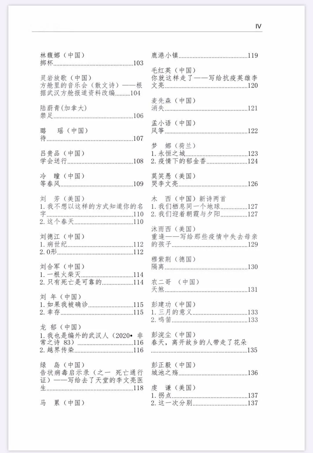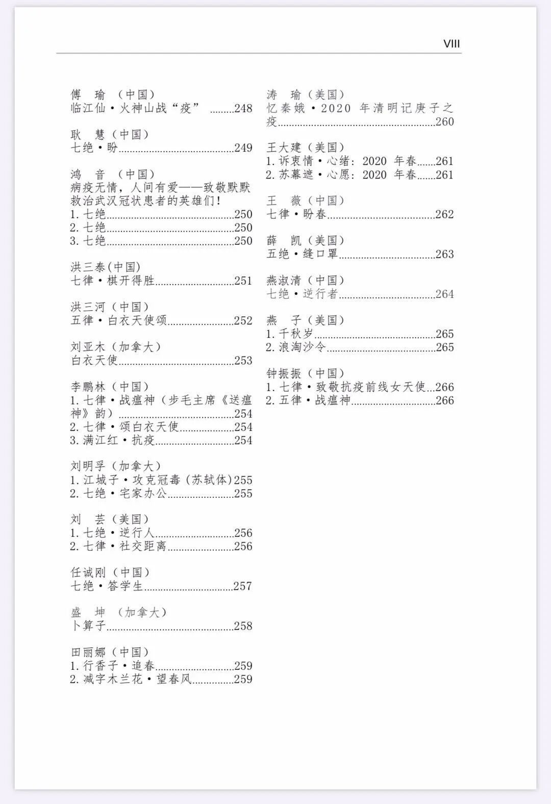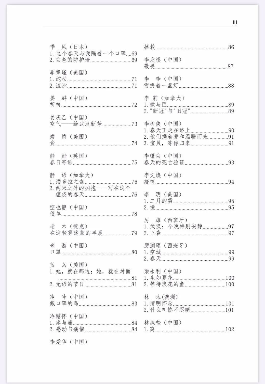 我们本着不厚名家、不薄新人,以作品质量为遴选的原则,经过数星期日以继夜的筛选,精选出两百余位诗人的近三百首优秀作品。这些诗人来自世界各地,有两岸三地土生土长的华语诗人,有包括日本、新加坡、澳大利 亚、新西兰在内的亚太国家的华语诗人,还有包括美国、加拿大、德国、英国等等远在西方国家的华语诗人。其中既有诗坛名家,也有诗界新秀,汇集了活跃在海内外诗坛的一线华语诗人的抗疫佳作。